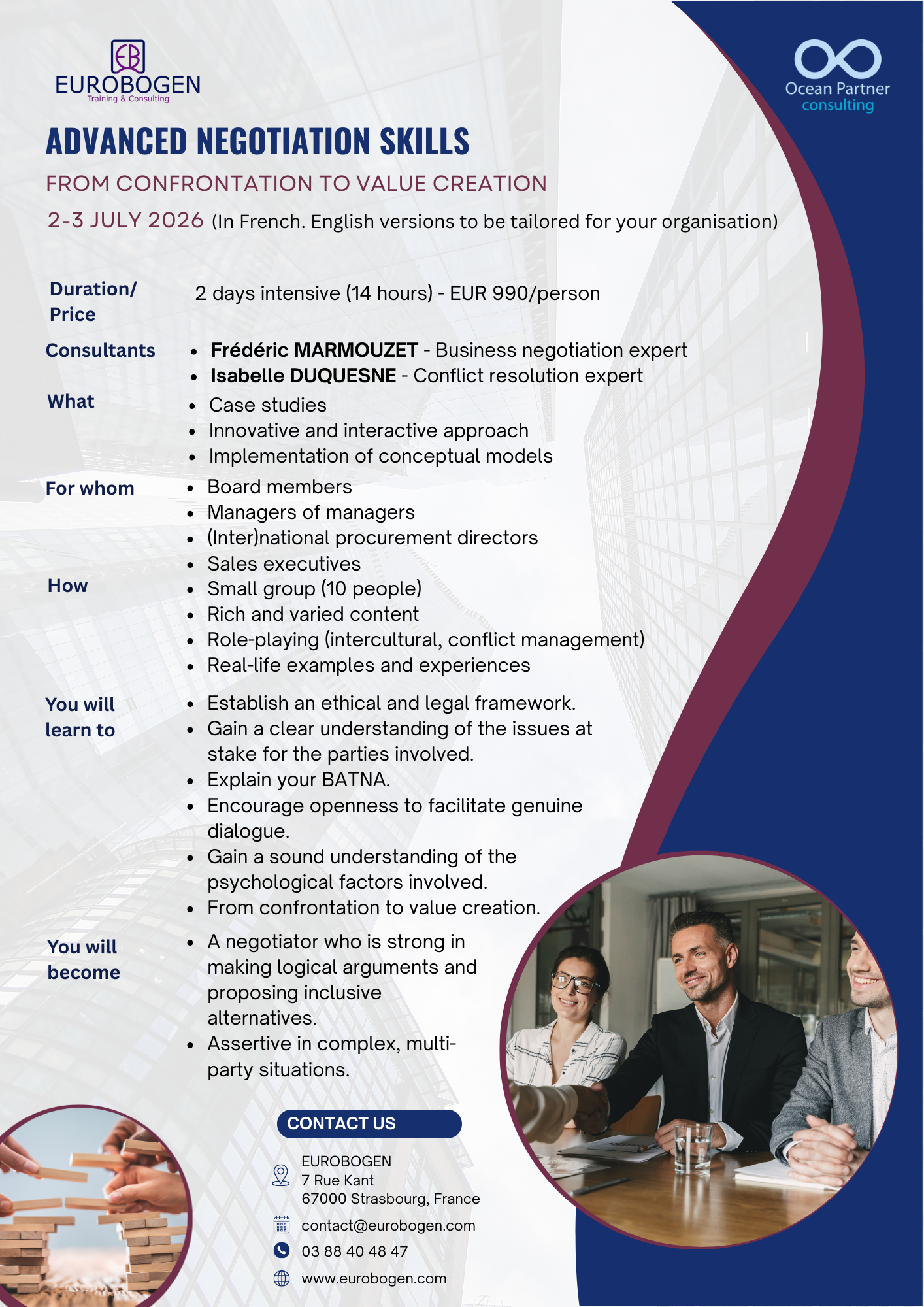 Let’s join an exclusive two-day intensive training course designed for executives, senior managers, and experienced managers who want to hone their advanced negotiation skills. In a small group (8 to 10 participants), you will benefit from rich and varied content, combining innovative methodological input, concrete scenarios (intercultural, tension management), and feedback from the field.